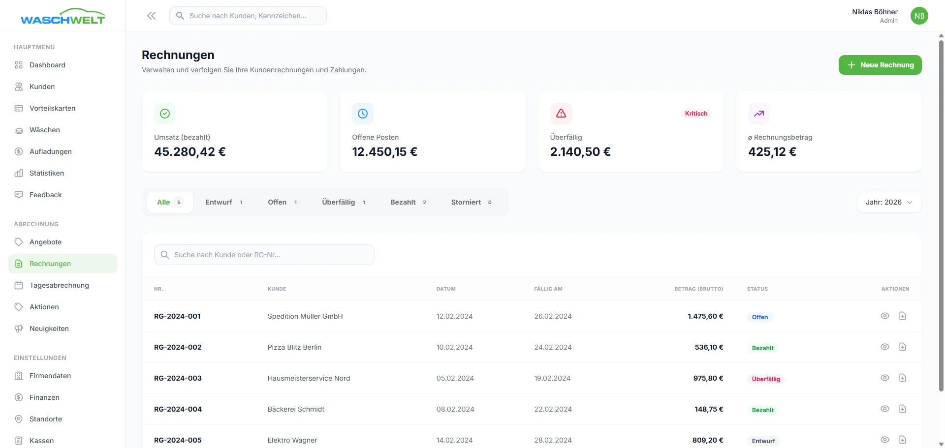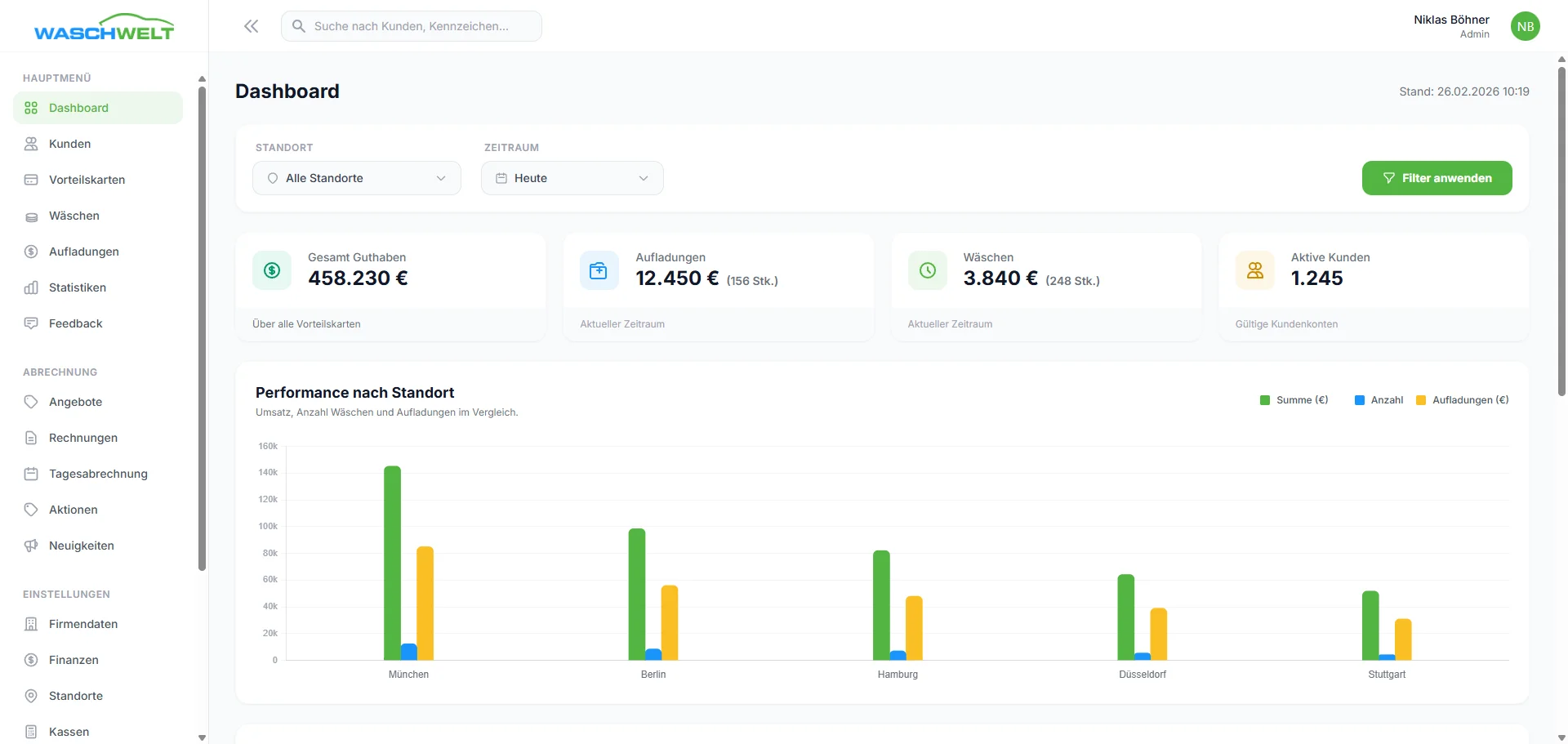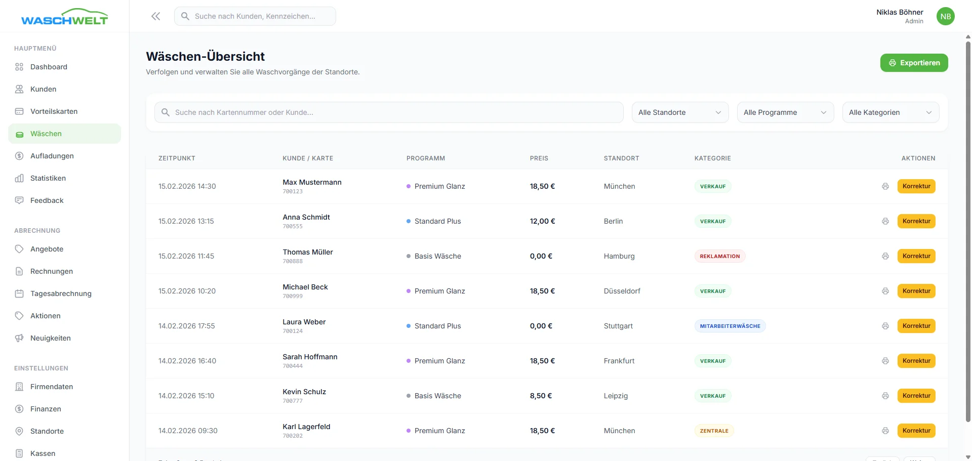 Entwicklung einer hochmodernen Management-Plattform für Waschstraßen-Ketten zur zentralen Steuerung von Standorten, digitalen Kundenkarten (Guthaben) und automatisierten Finanzprozessen.
