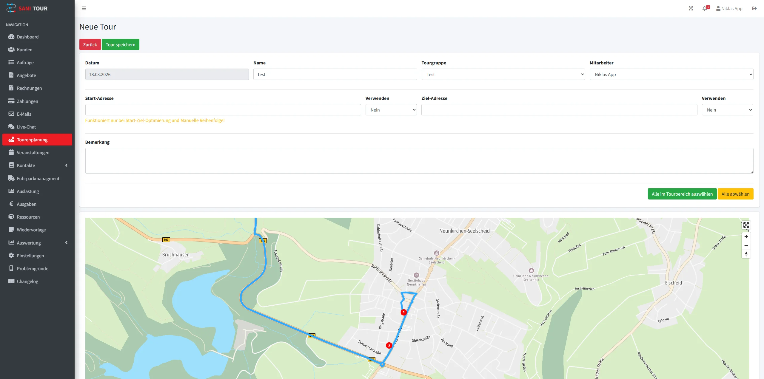 - Integrierte Tourenplanung mit Karte: Das Highlight der Software: Eine visuelle Tourenplanung auf Basis interaktiver Karten, die Logistikern hilft, effiziente Routen zu erstellen, Fahrzeuge optimal auszulasten und Serviceeinsätze präzise zu steuern.