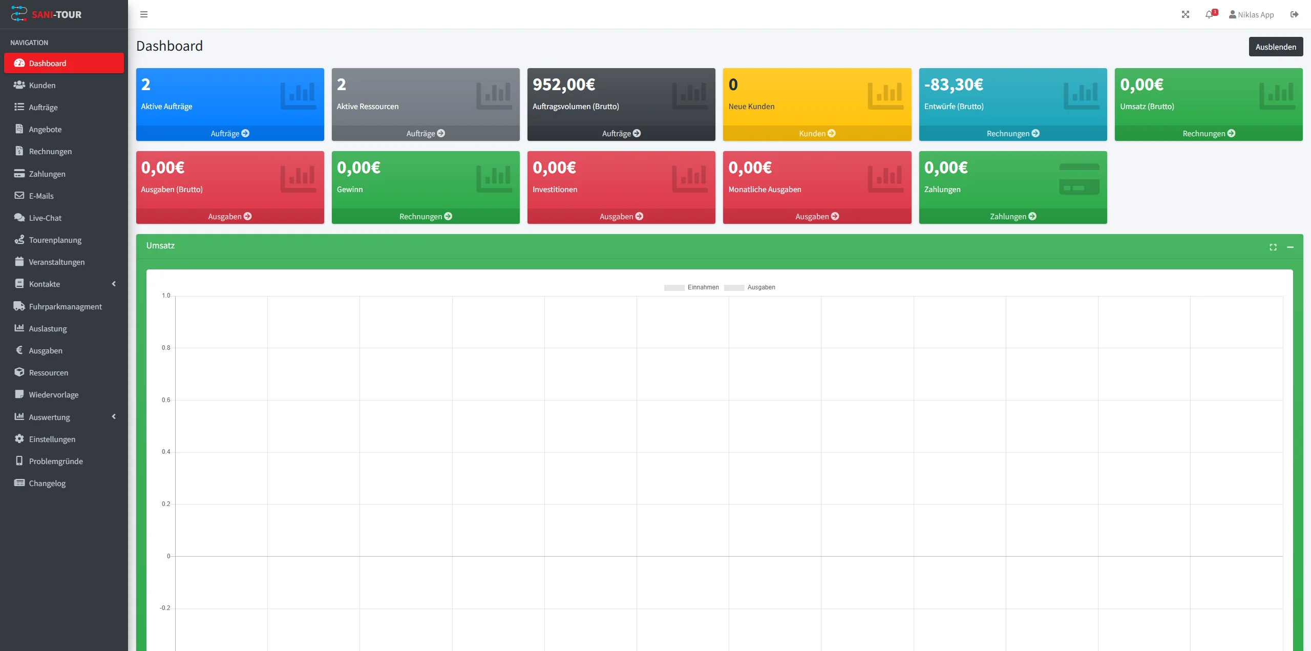 - Zentrales Dashboard: Echtzeit-Überwachung der wichtigsten KPIs wie Umsatz (Brutto/Netto), Gewinn, Ausgaben, Investitionen und aktive Aufträge für eine datengestützte Unternehmenssteuerung.
